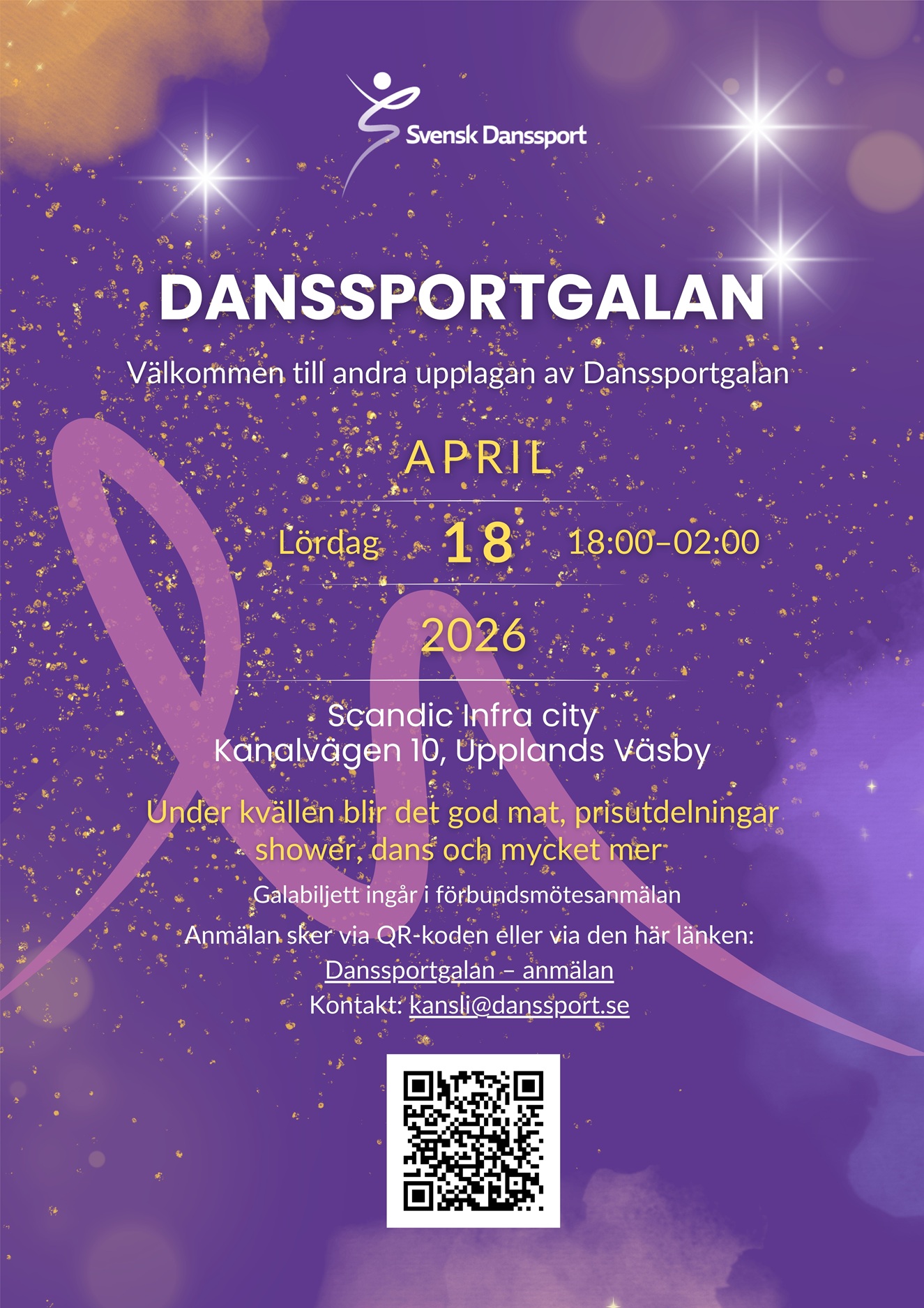 Lördagen den 18 april 2026 samlas dansare, ledare, föreningar och vänner av danssporten för en kväll fylld av hyllningar, glädje och gemenskap på Scandic Infra City i Upplands Väsby.