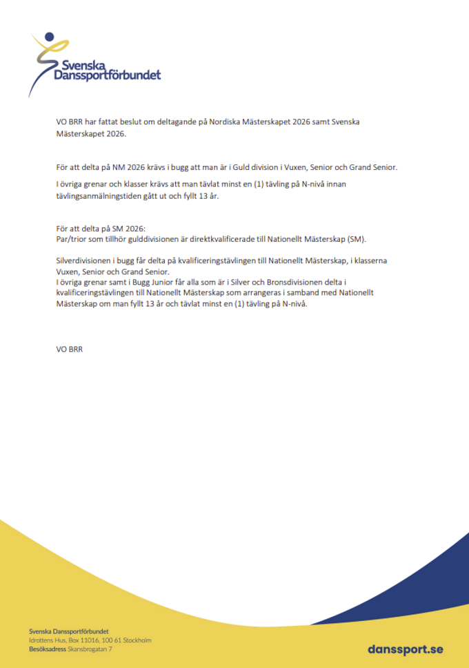 För att delta på SM 2026: Par/trior som tillhör gulddivisionen är direktkvalificerade till Nationellt Mästerskap. Silverdivisionen i bugg får delta på kvalificeringstävlingen till Nationellt Mästerskap, i klasserna Vuxen, Senior och Grand Senior.