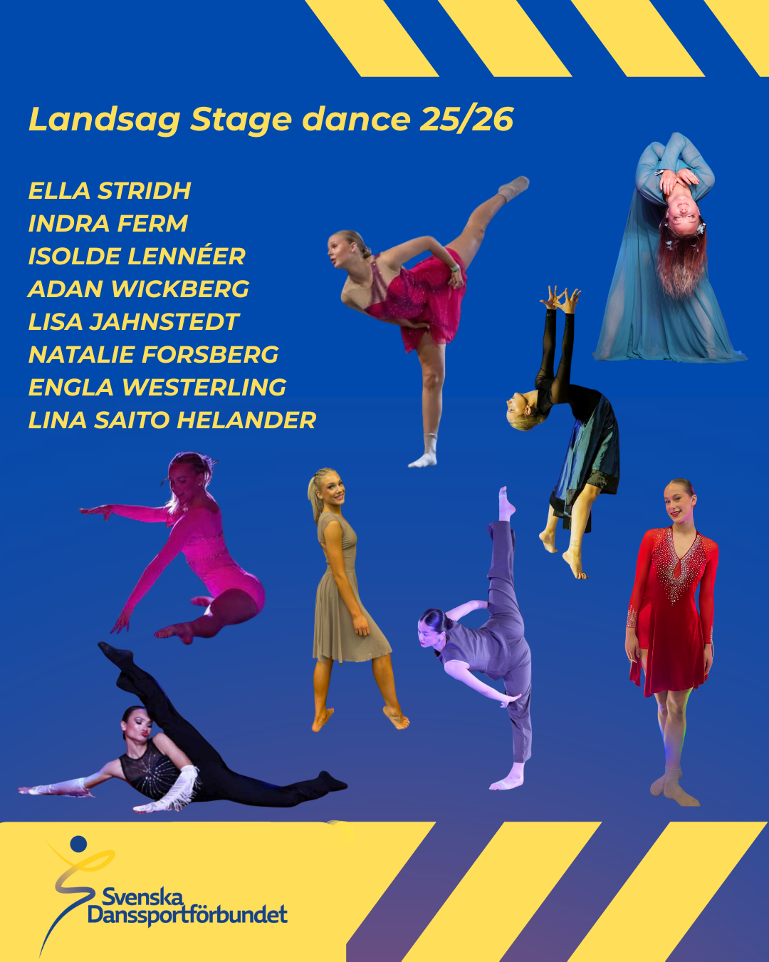 Sveriges åtta landslagsdansare i Stage dance har under året fortsatt att utvecklas och stärka sina prestationer. Med erfarenhet från flera internationella mästerskap har de byggt upp både rutin och självförtroende inför årets utmaningar. Konkurrensen är skyhög, men Sportchefen Judith Martinez Åkesson vågar ändå tippa på flera semifinalplatser och ett par finalplatser för det svenska laget.